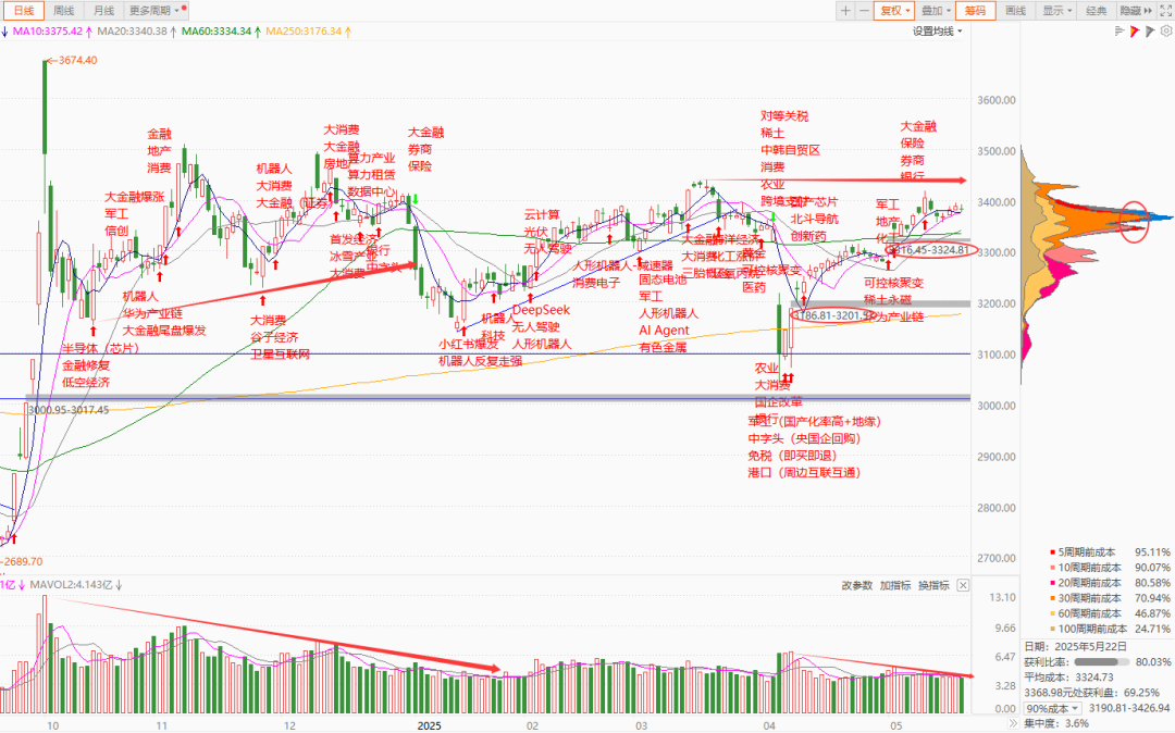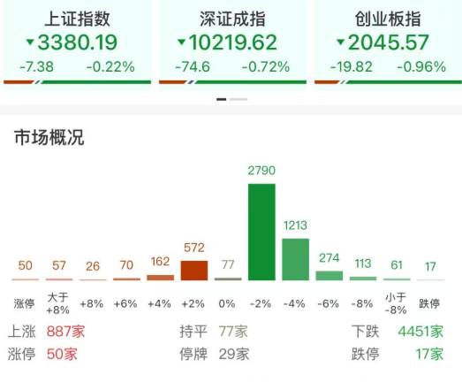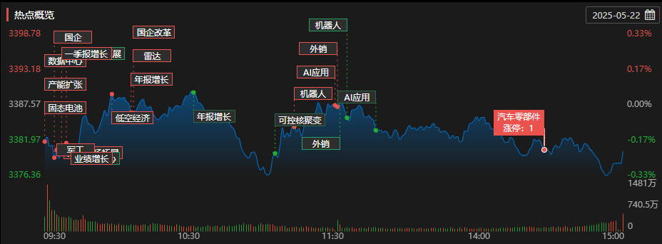 2025年5月22日,市场全天震荡调整,创业板指领跌,北证50指数跌超6%。上证指数跌幅0.22%,报收3380.19点,深证成指跌幅0.72%,报收10219.62点,创业板指跌幅0.96%,报收2045.57点。