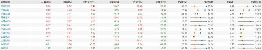 周四各大指数缩量调整,百分位、估值有所下移,可以作为参考因子,当分位点达到高点,可以辅助短期操作进行高抛,当分位点调整至低点,可以辅助短期操作进行低吸。中期可以在低估点位,逐步开始定投。((蓝色当前,黄色是平均)。数据来源:Wind